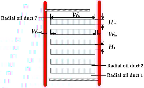 This study focuses on a transformer with a forced oil-directed cooling structure. The winding region of the transformer consists of winding discs, the axial spacing between the discs, and the radial spacing between the discs and the insulating cylinder. The latter two are referred to as axial and radial channels, respectively. The internal structure of the winding region of this type of transformer is illustrated in Figure 1. Figure 1a shows a three-dimensional model of the region between adjacent spacers in the winding area. Figure 1b presents a two-dimensional model of the winding region, where each section contains six winding discs, with each disc composed of 15 turns of conductors. The horizontal radial oil ducts are formed between adjacent discs, between the discs and the tank wall, and between the discs and the oil guide rings, totaling seven horizontal radial oil ducts. Additionally, two vertical axial oil ducts are formed between the discs and the left and right tank walls. The study specifically investigates the bottom oil duct region where reverse oil flow occurs. Figure 1c depicts the two-dimensional structure of a single turn of the winding disc, which consists of a copper conductor wrapped with insulating paper. In the forced oil-directed cooling system, the cooling oil is driven by an oil pump into the bottom of the winding. Guided by the oil guide rings within the winding, the cooling oil flows through the horizontal and vertical oil ducts, forming a “zigzag” flow path. This design ensures that the cooling oil comes into full contact with the heat-generating winding discs, facilitating efficient convective heat transfer and enabling the removal of a greater amount of heat. The schematic diagram of the winding region model parameters is shown in Figure 2. The ratio of the height of the bottom radial oil channel (H1) to the width of the outer axial oil channel (Win) is defined as α.