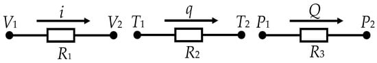 The construction of the flow network model requires that parameters such as pressure and flow rate satisfy Kirchhoff’s laws, allowing it to be analogously represented as an equivalent electrical circuit. The corresponding equivalent variables are summarized in Table 1. As illustrated in the electro-thermal-flow analogy in Figure 3, the oil channel flow rate Q is primarily determined by the pressure drop ΔP between nodes and the flow resistance R within the channel. The flow resistance R is predominantly influenced by frictional losses during fluid motion, with secondary contributions from pressure losses due to changes in flow direction.
