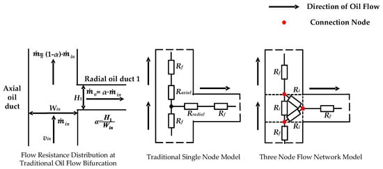 Traditional flow network models typically employ a single-node approach at the bifurcation or confluence of oil flow paths, which only accounts for the forward flow of oil into the adjacent channels. However, the actual flow dynamics at the intersection of oil channels are considerably more complex. The conventional single-node models are inadequate for accurately predicting the distribution of oil flow within winding regions, particularly in scenarios involving reverse flow. To address this limitation, additional nodes must be introduced at the points of flow bifurcation and confluence. This enhancement allows for the precise prediction of flow splitting, merging, and pressure drop reversals in radial channels, while ensuring that the principle of zero net pressure drop in a closed loop is not violated.