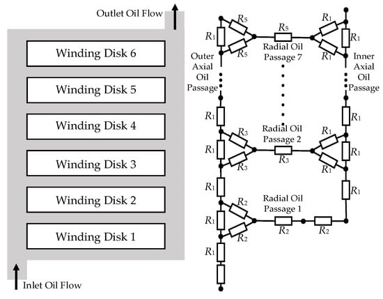 Based on the aforementioned flow resistance models for various oil ducts, the flow resistance modules are systematically integrated by utilizing the circulating flow path of the oil within the winding region. This integration is achieved by constructing a flow network model for the winding region, which is analogous to an electrical circuit, as illustrated in Figure 5.