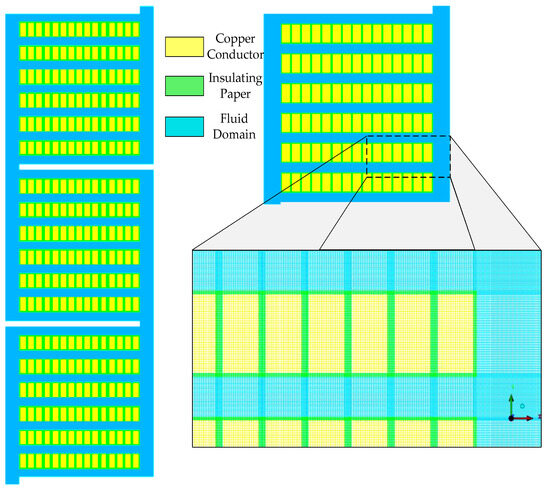 In this study, the two-dimensional unstructured mesh for the transformer winding region was generated using ANSYS ICEM CFD 2021 R1 software, as illustrated in Figure 6. The computational mesh model comprises a total of 823,402 elements. The copper conductors, which are wrapped with 0.5 mm thick insulating paper, and the insulating paper domain itself, were both discretized using square elements. To enhance computational accuracy and convergence reliability, the fluid–solid interface was refined with two layers of thin rectangular elements. The boundary elements account for 159,300 elements, representing 19.35% of the total mesh. This refined mesh structure ensures the precise extraction of physical quantities such as velocity and temperature within the fluid domain.