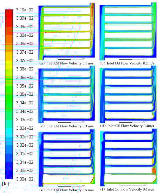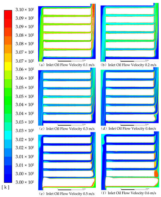 At the critical flow stage observed in Figure 18d, while the temperature curves of the two channels still intersect, their variation trends differ from the previous cases. As shown in Figure 18e,f, when the inlet velocity increases to 0.5–0.6 m/s, the overall temperature of radial oil channel 1 becomes consistently higher than that of radial oil channel 2. The temperature curves of the two channels gradually converge from left to right, reaching similar values at the outlet. This indicates that the oil flow in radial oil channel 2 splits at the channel intersection, with part of the oil flowing downward through the inner axial oil channel. Consequently, a reverse oil flow effect is triggered in radial oil channel 1, causing the oil to flow from right to left.