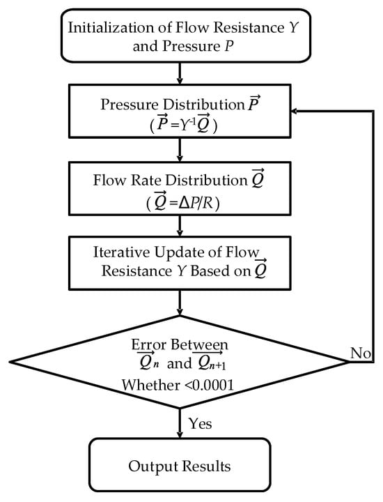 Based on the flow network model constructed for the winding region in this study, the flow resistance parameters of each oil channel were systematically combined and arranged to form a flow resistance parameter matrix. This matrix was then utilized in the computational process outlined in the flowchart presented in Figure 8. The iterative procedure involved calculating the pressure and flow rate matrices, with continuous updates applied until the discrepancy between successive flow rate values fell below a predefined threshold. Upon convergence, the final flow rate distribution was output, providing the predicted flow distribution within the winding region as determined by the model.