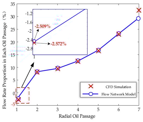 When the Reynolds number (Re) at the inlet is 1215.298 and α = 0.5, the flow rate proportions predicted by the flow network model constructed in this study are compared with those obtained from the CFD simulation model, as illustrated in Figure 9. The results reveal that the flow network model predicts a flow rate proportion of −2.509% for the bottom radial oil channel 1, indicating a reverse flow direction contrary to the normal flow pattern. This observation suggests the occurrence of reverse oil flow in the bottom radial oil channel 1. Furthermore, the flow rate proportions predicted by the flow network model for the other radial oil channels demonstrate excellent agreement with the CFD simulation results, with a maximum deviation of only 3.02%. Notably, the prediction for the bottom radial oil channel 1 (−2.509%) closely matches the CFD model result (−2.572%), highlighting the capability of the flow network model to preliminarily identify the triggering of reverse oil flow effects in the bottom oil channels.
