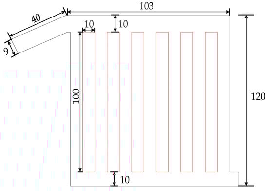 The primary focus of this study is the bottom oil channel of the transformer winding. To facilitate the investigation, a single-stage winding was employed as an alternative to the conventional three-stage winding for the experimental setup. Initially, an equivalent model of the single-stage transformer winding was constructed in CFD and compared with the three-stage winding. This comparison determined that the angle between the upper wall and the horizontal plane at the inlet was 36.23°, with an upper wall length of 40 mm, as illustrated in Figure 10.