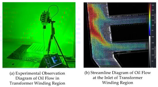 Based on the established model dimensions, transparent acrylic plates were selected, and a three-layer design was adopted. The transformer winding plates were fabricated using a milling machine and observed through a particle image velocimetry (PIV) system. To ensure accurate tracking of the oil flow, hollow glass microspheres with diameters ranging from 10 to 20 μm were introduced into the oil. During the experiment, a light-emitting sheet was positioned horizontally to ensure that the illuminated measurement plane was two-dimensional. The position was adjusted so that the light source was aligned with the inlet of the single-stage winding model. A high-resolution CCD camera was placed perpendicular to the measurement plane to capture particle images under two pulsed light exposures. Subsequently, the captured particle images were divided into small regions for cross-correlation analysis, generating a velocity field across the entire measurement plane. The experimental setup and observation results are depicted in Figure 11a.