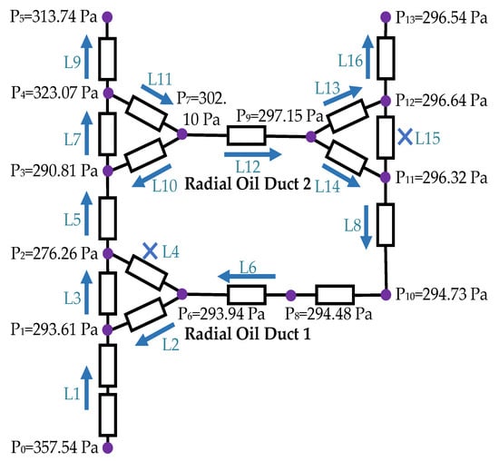Figure 12 illustrates the pressure distribution and oil flow behavior among the nodes in the winding region flow network model when reverse oil flow occurs in the bottom radial oil channel. The figure reveals that when reverse flow appears in radial oil channel 1, the pressure at node 10 (294.73 Pa) is higher than that at node 6 (293.94 Pa). This observation aligns with the discussion in Section 2.1 of this study, which states that reverse flow in the bottom radial oil channel is caused by a pressure drop reversal across the channel. Additionally, the established three-node flow resistance model accurately predicts the pressure differences between various nodes, such as node 9 (297.15 Pa), node 11 (296.32 Pa), and node 12 (296.64 Pa). By analyzing the sign of the pressure drop, the flow direction between nodes can be easily determined, thereby identifying the occurrence of reverse flow in the bottom radial oil channel.