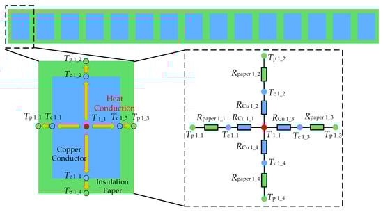 Taking a single turn of the winding disk as an example, a thermal model for the conductor-insulation paper unit was developed based on the heat flow patterns within the conductor-insulation paper. Initially, the center of the copper conductor was designated as the heat source. Heat is generated at this source, and driven by the thermal properties of the copper conductor, is conducted through solid materials. The heat then propagates from the center of the heat source to the interface between the copper conductor and the insulation paper, facilitating heat transfer between copper elements. Consequently, the conductive thermal resistance between copper conductors, denoted as RCu, was established in accordance with heat transfer theory, as follows: