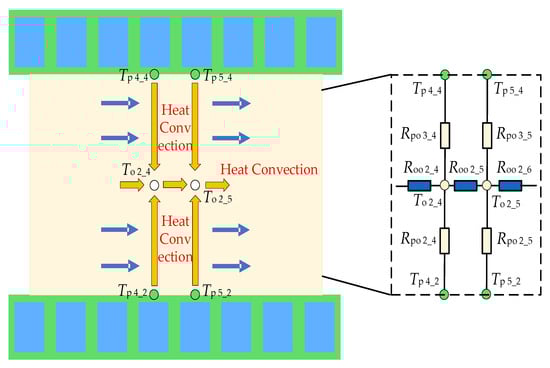 Based on the findings from Section 3, the flow conditions within the winding region can be preliminarily inferred. To more efficiently and accurately elucidate the reverse oil flow effect inside oil-immersed transformers, a thermal network model for the winding region was developed in this section.