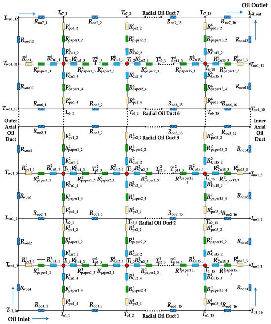 Integrating the previous heat transfer analyses, the overall heat flow pathway is determined as: copper conductor → insulation paper → oil flow. The thermal models of each unit module are combined and connected according to the actual direction of heat flow to construct a thermal network model, as illustrated in Figure 15. Based on the specific structural distribution of the winding region, the thermal network model is divided into seven radial oil channels, two axial oil channels, and six winding disks. Each winding disk is further divided into 15 turns, containing 15 heat sources, resulting in a total of 90 heat sources. The oil flow within each oil channel is represented by convective thermal resistance, which correlates with the temperature at various points of the oil flow, facilitating the analysis of temperature distribution patterns under different inlet flow velocities.