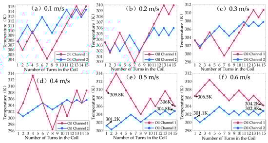 When the inlet oil velocity ranges from 0.1 to 0.3 m/s, the oil temperatures at the inlets of both radial oil channels 1 and 2 (at the first turn) are nearly identical. The temperature variation curves of the two channels intersect at certain points, showing a consistent increasing trend from left to right. Notably, radial oil channel 1 exhibits a greater temperature variation amplitude, with its outlet oil temperature (at the 15th turn) consistently higher than that of radial oil channel 2.