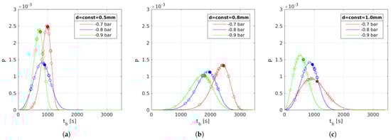 - The insulation thickness of winding wires significantly affects the dispersion of measurement results (in the context of a normal distribution, dispersion is characterized by the standard deviation , while for the Weibull distribution, it is described by the shape parameter , where a higher indicates lower variability in the experimental results). In Table 2, the influence of insulation thickness is noticeable for samples with mm, where the insulation thickness was mm. This parameter still meets the standard requirements [19]; see Table 1.