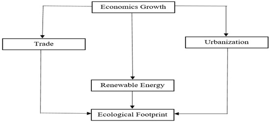 In a more specific context, ref. [51] undertook a modeling and calibration exercise utilizing Autoregressive Distributed Lag (ARDL) and Vector Error Correction Model (VECM) frameworks for China. The outcomes of their analysis reveal a consistent linkage between trade and economic growth. Furthermore, refs. [51,52] found that the escalating environmental degradation exerts a positive impact on both renewable energy resources and trade dynamics. As illustrated in the conceptual framework (Figure 1), this interplay highlights the intricate relationships between economic growth, environmental considerations, and trade dynamics, emphasizing the depth and complexity of these global economic interactions.