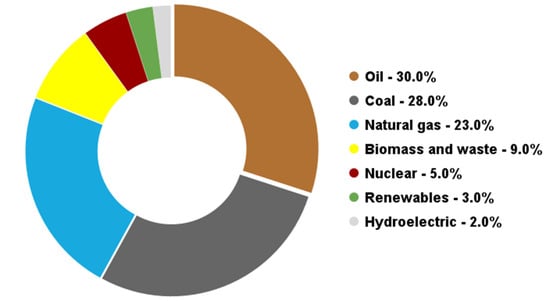 According to Figure 1, the Energy Information Administration (EIA) forecasts for 2050 that global energy consumption will have increased (2022 reference) from 638 quadrillion British thermal units (quads) to 855 quads in 2050 (34%). Following the trend where renewable energy consumption is gaining increasing relevance in a global perspective, solar and wind energy sources have been growing faster than any other energy source. Non-fossil fuel share as a primary energy source tends to increase over the years, from 21% in 2022 to up to 34% in 2050. Natural gas consumption has been recording the most significant increase among fossil fuels, from 153 quads in 2022 to up to 241 quads in 2050, an increase of approximately 57% [74]. Figure 2 shows the global energy matrix in 2023.