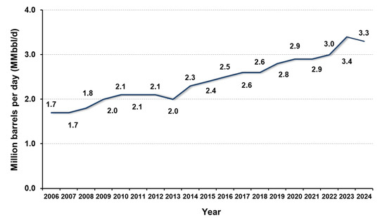 As shown in Figure 4, the USA led oil production in 2023, with an average of 12.90 MMbbl/d. Brazil was the eighth largest oil producer, producing approximately 3.40 MMbbl/d. This fact was only possible due to the discovery of the pre-salt accumulations in 2006 in Brazil [78]. Although both “MM” and “M” represent millions depending on the reference and system in use, the petroleum industry conventionally uses “MM”, as in MMbbl (million barrels of oil), while the International System of Units (SI) uses “M”, as in MW (megawatts) to denote power. Figure 5 shows Brazil’s oil production over the years, from 2012 until the second quarter of 2024.