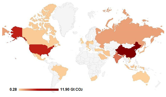 In recent decades, growing concerns about gas emission rates and their effects on the climate have prompted a global transformation in energy sources [82]. Figure 6 shows the countries that produced the most carbon dioxide (CO2) in 2023.