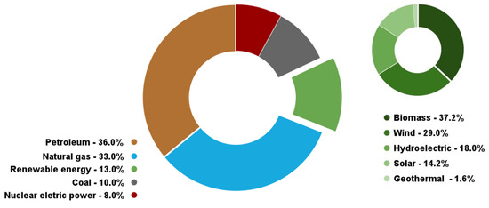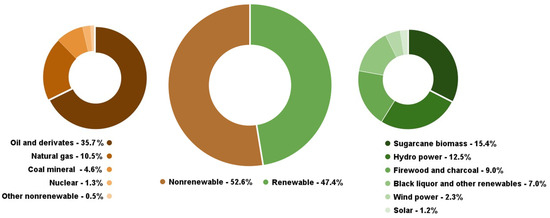 Brazil’s energy matrix, despite the large amount of oil and natural gas produced, is more renewable and cleaner on a global scale [88]. The renewable energy sources in Brazil reached 47.4% in 2022, an increase of 2.6% compared to 2021. This fact occurred due to the expansion of hydroelectric power, growth in wind and solar power generation, and other renewable sources such as black liquor, biogas, and biomass [89]. This fact is important due to the need to reduce GHG emissions. Figure 9 shows the Brazilian energy matrix.