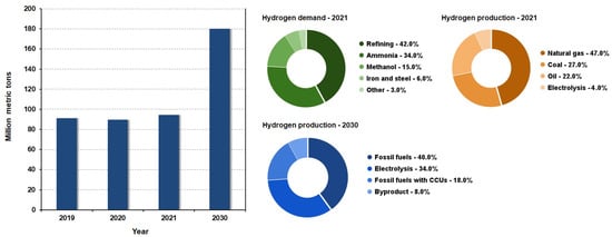 Hydrogen demand worldwide from 2019 to 2021 and a forecast for 2030. Source: adapted from [56,97].