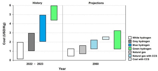Global hydrogen demand reached 94 Mt (million metric tons) in 2021, and it is expected to double by 2030, reaching a total of 180 Mt [56]. Hydrogen was mainly used in the processes of refining (42.0%), ammonia (34.0%), methanol (15.0%), and iron and steel (6.0%). Currently, most of hydrogen production comes from fossil fuels, i.e., natural gas and coal [70,98]. From 94 Mt of hydrogen produced in 2021, only 0.04% was produced from water electrolysis using renewable energy sources [99]. Producing green hydrogen through water electrolysis is seen as the main method of hydrogen production; however, the current cost remains relatively high [62]. Figure 15 shows the hydrogen production cost in 2022–2023 and projections for 2060.