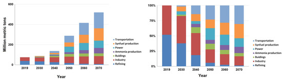 It is expected that by 2070, hydrogen production will suffer a gradual transformation, with the majority being generated from electricity sourced from renewable energies and fossil fuels associated with CCUS [58]. It is expected to produce the following amount of hydrogen in 2070: 31 Mt of fossil hydrogen (produced from fossil fuels) without CCUS, 213 Mt of fossil hydrogen with CCUS, and 291 Mt of low-carbon electricity [101]. This gradual change will occur due to several key factors. The main factor is the electrolysis cost reduction, with solar panel costs expected to decrease by 40% and turbine costs by 27%. With advancements in turbine size and solar panel technologies, annual operating hours could increase by 10 to 30% depending on the technology and region. Additionally, the capital costs of electrolyzers are projected to drop by 25 to 30% as financial risks continue to decrease. The growing demand for low-carbon energy in sectors like steel production, ammonia manufacturing, and aviation will further drive adoption. Policy and regulatory support will accelerate this change through subsidies, carbon pricing, and incentives promoting renewable hydrogen. Finally, energy security concerns and market changes will encourage countries to reduce reliance on fossil fuel imports by investing in domestic renewable hydrogen production, solidifying its role in the global energy landscape. Thus, the global average cost of green hydrogen, which was USD 5 per kg in 2020, is expected to reach USD 2 per kg [102]. Figure 17 shows the forecast hydrogen demand worldwide in a sustainable development scenario from 2019 to 2070 by sector.