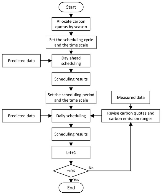 In the day-ahead phase, with a 24 h cycle and a time resolution of 1 h, the system’s operational cost is minimized as the objective function. A Branch and Bound method was employed for global optimization to obtain the day-ahead operational schedule. In the intra-day real-time phase, the cycle is set to 1 h, with a time resolution of 15 min, and intraday optimal dispatch is executedg. Figure 2 presents the multi-timescale rolling scheduling workflow established in this study.