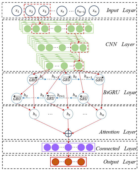 BiGRU extends the traditional gated recurrent unit (GRU) by introducing bidirectional propagation, enabling the network to capture both past and future context [25,26]. This enhancement improves the model’s ability to represent complex temporal relationships and enhances prediction accuracy.