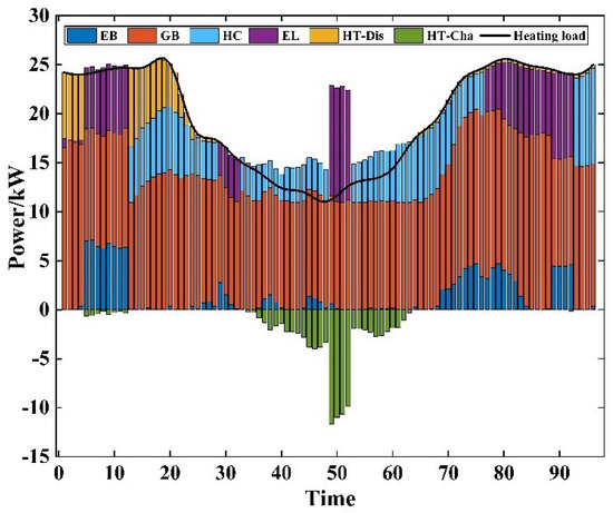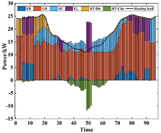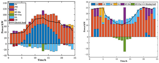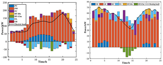 The scheduling diagrams for each scenario reveal that in the optimized model, the heat load is primarily met by gas and electric boilers, with supplementary support from the hydrogen–thermal coupling component and thermal storage system. Electricity demand is predominantly satisfied by wind and solar power, with batteries providing compensation for shortfall. When wind resources are abundant and electricity demand is low, the electric boiler converts surplus electricity into heat, operating in tandem with the gas boiler to meet thermal requirements. This approach not only reduces heating costs but also facilitates the integration of excess wind power. During periods of high electricity demand and low heat demand, surplus thermal energy is stored in the thermal storage tank for later use during peak heating periods, thereby minimizing waste and optimizing operational efficiency.