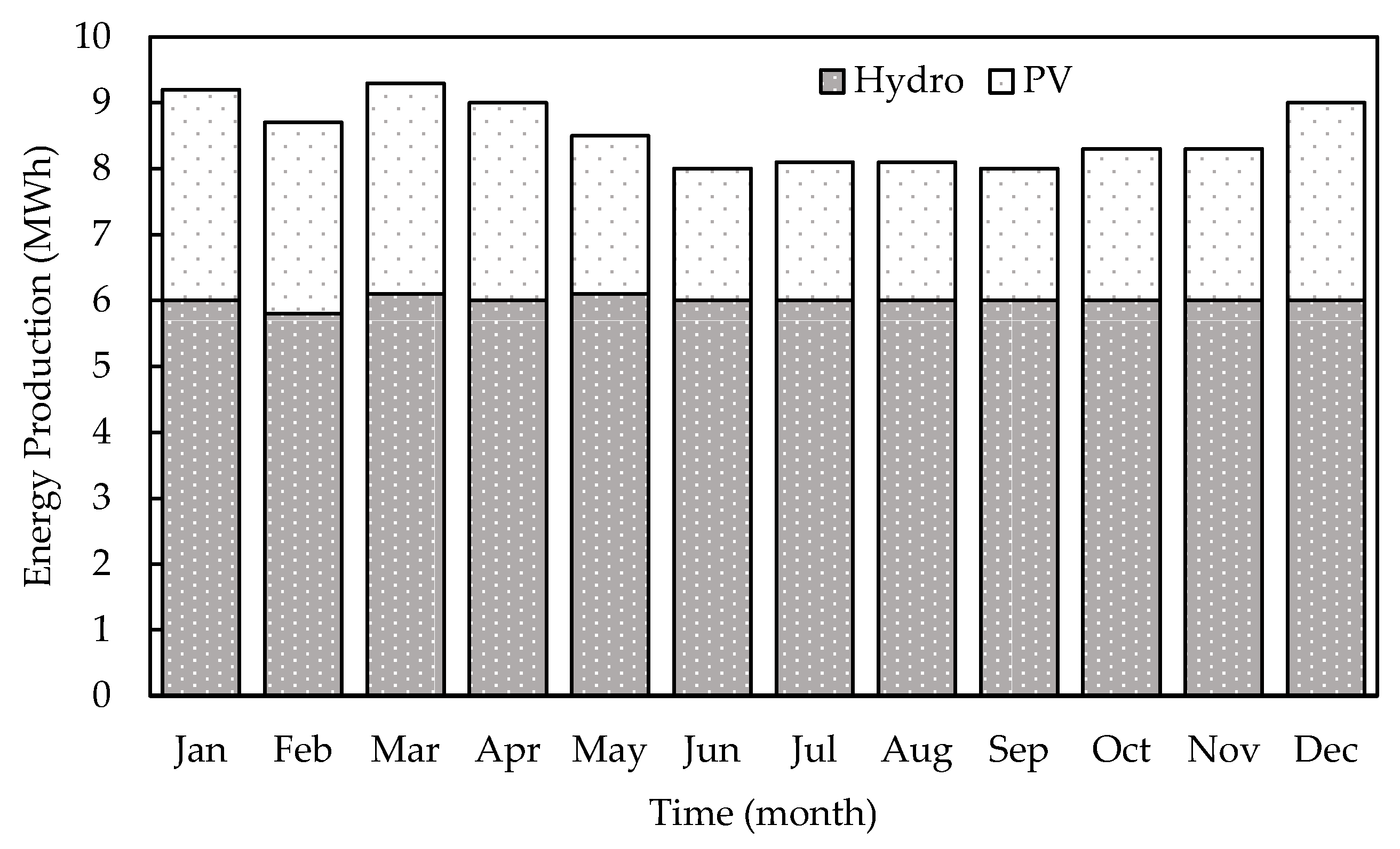 | Month | Hydro Generation (kWh) | PV Generation (kWh) | Total Generation (kWh) | Load (kWh) | Net Energy Flow (kWh) |
