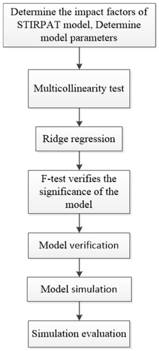 The flowchart of the methodology used in this study is presented in Figure 1. First, the impact factors of the STIRPAT model were identified and the parameters of the STIRPAT model were determined. The details are shown in Section 2.2. Second, in order to fit the prediction model, the multicollinearity test for each parameter in the model was carried out to determine whether each independent variable was linearly correlated. Thirdly, the ridge regression was used to fit each parameter to deal with multicollinearity parameters. Then, the F-test was utilized to verify the ridge regression. This is because the F-test is designed to test whether three or more independent variables have a significant effect on the dependent variable. Finally, the data from the Guangzhou Statistical Yearbook were used to verify the established model, and then the model simulation was carried out and the simulation results were evaluated.
