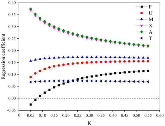 When the regression model was not significant, we searched for the independent variable with the smallest impact on the dependent variable according to Table 3. Through comparison, it was found that the standard regression coefficient of “permanent population” was only 0.0025, which is the smallest among all independent variables. Therefore, the independent variable “permanent population” was removed and ridge regression was conducted.