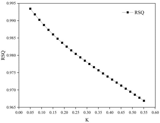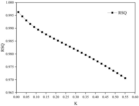 The first ridge regression plot and correlation coefficient variation diagram are shown in Figure 2 and Figure 3, respectively. Figure 2 shows that when K ≥ 0.05, the regression coefficients of all variables tend to stabilize, and when K ≥ 0.08, the regression coefficients of all variables are positive. According to the value principle of K, this study selected K = 0.08 for regression. According to Figure 3, the determinability coefficient of the regression model is 0.991, indicating a high degree of goodness of fit.