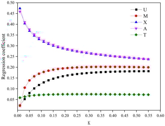 The second ridge regression plot and correlation coefficient variation diagram are shown in Figure 4 and Figure 5, respectively. Figure 4 shows that when K ≥ 0.03, the regression coefficients of all variables are positive and stable. This study selected K = 0.03 for regression. As shown in Figure 5, the determinability coefficient of the regression model is 0.995, indicating a high degree of goodness of fit.