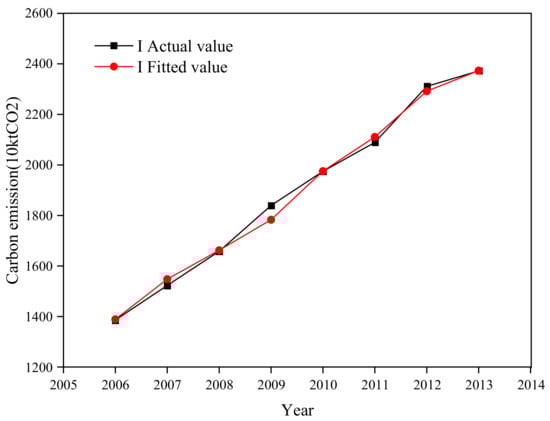 The actual value of ln was compared with the fitted value obtained from model (5) to obtain Figure 6. It can be seen that the model fits well. According to the regression results after model standardization, it can be concluded that the added value of the tertiary industry in Guangzhou has the greatest impact on the total carbon emissions of buildings, with an elasticity coefficient of 0.4096, followed by the level of household consumption, with an elasticity coefficient of 0.4035. The impacts of urbanization rate and carbon emissions per unit of public building area were relatively small, with values of 0.0524 and 0.0635, respectively.
