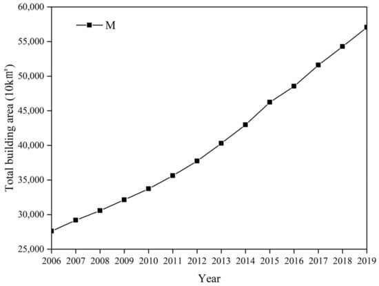 Because the data of “actual residential floor area at the end of the year” in the statistical yearbook did not count all residential buildings, the data are too small. The total residential floor area data in this study were the average residential floor area per person multiplied by the permanent population (where the average per capita residential floor area is equal to the average per capita living area multiplied by the actual residential floor area at the end of the year divided by the actual residential living area at the end of the year). The public building area was calculated using the actual building area at the end of the year; that is, the actual residential building area at the end of the year.