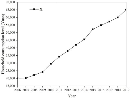 The changes in the consumption level of Guangzhou residents in recent years are shown in Figure 9, which shows that the consumption level of Guangzhou residents shows a linear growth trend, according to which a linear regression was performed on the data of the total building area of Guangzhou from 2006 to 2019. The following fitting results were obtained: