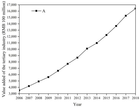 The changes in the added value of the tertiary industry in Guangzhou in recent years are shown in Figure 10, which shows that the added value of the tertiary industry in Guangzhou shows a linear growth trend, according to which a linear regression was performed on the data of the total building area of Guangzhou from 2006 to 2018. The following fitting results were obtained:
