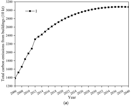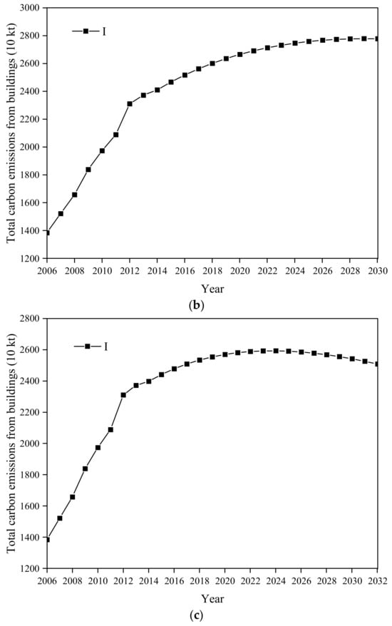 Variation in total carbon emissions from buildings in Guangzhou, 2006–2030 (a) ∆T = −4%, (b) ∆T = −5%, (c) ∆T = −6%.
