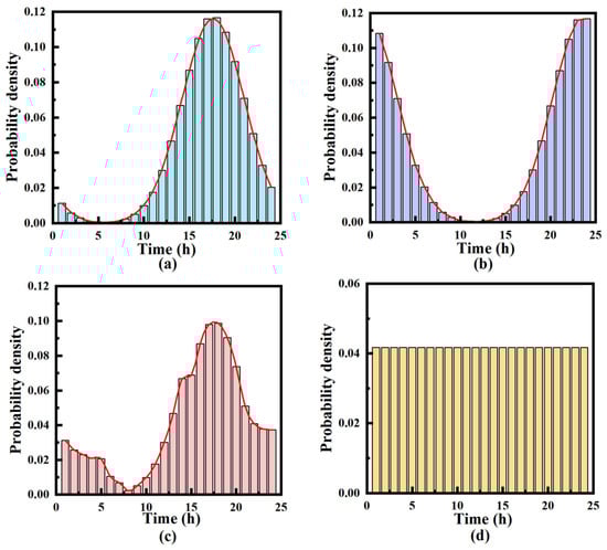 Probability distribution of charging onset moments for four charging modes: (a) Disordered mode; (b) Ordered mode; (c) Peak-load shifting mode; (d) Equalization mode.