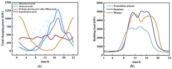 In the practical operation of integrated energy systems, the load side must account for both EV charging loads and building loads. For estimating the EV charging load, this paper employs the Monte Carlo sampling method, using the method and data as referenced in [31]. The Monte Carlo sampling stage mainly provides input parameters such as the mean and variance for the daily mileage distribution function and the charging start time distribution function. It provides data support for the peak-shaving, equalization, and valley-filling of electric vehicles. Based on the input probability density function, a random sample of n = 2000 electric vehicles is generated using the Monte Carlo method, and the daily driving mileage and charging start time sample-set generated by Monte Carlo random sampling are obtained. That is, the daily driving mileage is extracted based on the probability distribution of the daily driving mileage, and the charging start time is determined by combining the probability distribution of the starting to charge time. Then, the total charging power of the electric vehicle is obtained from the probability distribution of the charging power and the probability distribution of the battery capacity, respectively. This approach utilizes the probability distribution of daily driving mileage to extract the driving distance for each day is combined with the probability distribution of starting to charge time to determine the initiation moment for charging. Subsequently, the total charging power for EVs is obtained through the probability distribution of both charging power and battery capacity. To investigate the flexibility of EVs, four distinct charging modes are proposed to regulate the charging start time of 2000 EVs within the park, which is helpful for facilitating the load peaking. The specific charging modes are illustrated in Figure 2, including four typical modes of the disordered mode, the ordered mode, the peak-load shifting mode, and the equalization mode. The results of the sampling calculations for the daily loads across these four modes are presented in Figure 3a. Additionally, the load characteristics of typical buildings are analyzed, and the typical daily loads in summer, winter, and transition seasons are calculated using EnergyPlus 8.7.0 based on the meteorological data of 2024, as shown in Figure 3b.