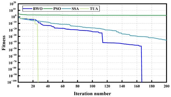 In order to present the performance of the optimization algorithm used in this paper, BWO, PSO, and SSA are selected as the comparison algorithms, and the number of iterations is set to 200 and the number of populations to 30. The convergence ability of different optimization algorithms to test the benchmark function is obtained, among which the TUA has the fastest convergence speed, and the fitness function is lower when converging. At the same time, the average time values of the test results of the four algorithms for the benchmark function are 0.128 s, 0.073 s, 0.079 s, and 0.014 s. In summary, the TUA has the fastest solving speed and good convergence ability, so it is chosen as the optimization algorithm (Figure 5).