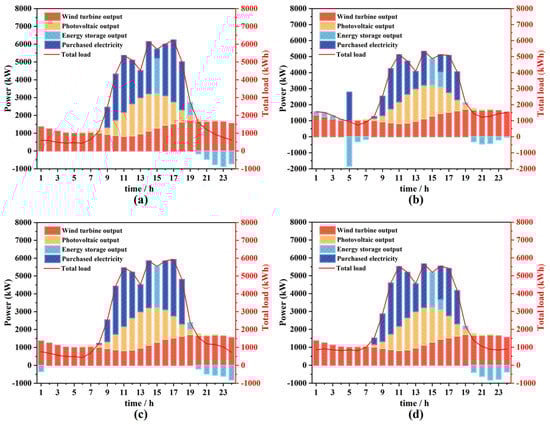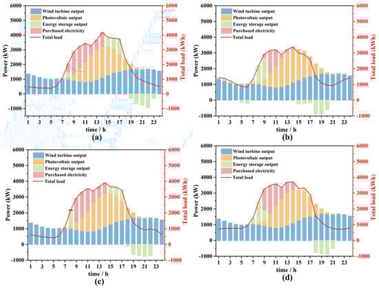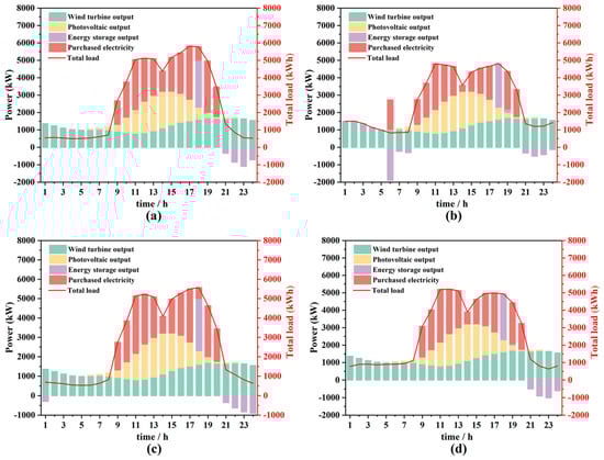 Figure 7 illustrates the impacts of various EV charging strategies on wind power generation, purchased electricity, energy storage, and total load during typical winter days. In Figure 7a, when EVs are charged in disordered mode (MB-1), the total load experiences a sharp increase during day-time peak hours, leading to a heightened demand for purchased electricity. During this time, wind and PV outputs fluctuate naturally, exhibiting lower levels at night. Consequently, the energy storage systems charge overnight and discharge during the day to help maintain balance. In contrast, Figure 7b depicts the charging of the EVs in ordered mode (MB-2), which results in a smoother total load curve. This approach mitigates load growth during peak hours, reduces the demand for purchased power, and efficiently schedules wind power and electricity generation without any curtailment of wind and PV power generation. In Figure 7c, EV charging occurs in peak-load shifting mode (MB-3), focusing on a scenario in which EVs are predominantly charged during night-time off-peak periods. This strategy significantly reduces the total load and purchased power demand during the day, thereby allowing the energy storage system to store more electricity overnight and discharge it during the day to meet load requirements. Finally, in Figure 7d, EV charging occurs in equalization mode (MB-4), which maintains the total load at a high level, consequently increasing the demand for purchased electricity. Compared to the MB-1, the wind curve-up rate under MB-2, MB-3, and MB-4 is reduced by 100%, 23.93%, and 62.37%, respectively. Concurrently, these strategies achieve savings in purchased power of 19.34%, 4.63%, and 12.06%.
