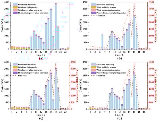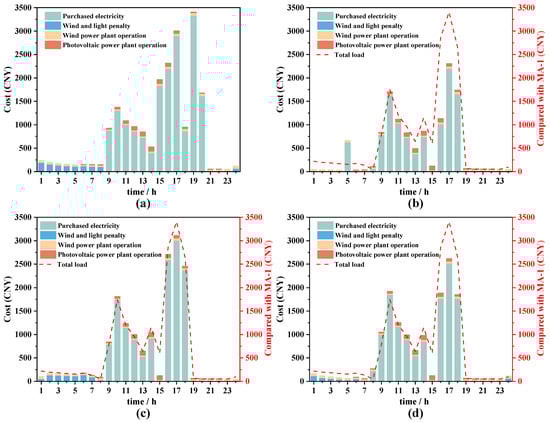 In Figure 9c, EV charging operates in peak-load shifting mode. Although the total load costs at different times remain similar to those observed in MA-1, the improvements are still evident. The primary objective of MA-3 is to balance peak and valley loads. While its effectiveness in minimizing cost fluctuations is not as pronounced as in MA-2, it does contribute to mitigating the impact of peak loads to some extent. During peak hours, the cost of purchased electricity continues to represent a significant proportion of the total costs, and instances of curtailment of wind and PV power generation occur during off-peak periods. In comparison to MA-1, the total purchased electricity cost in a single summer day decreases from CNY 15,089.97 to CNY 14,082.47, reflecting a reduction of 6.68%. Additionally, the wind and solar penalty costs decline from CNY 1055.48 to CNY 806.72 (a decrease of 48.06%). This suggests that while the mode has enhanced the utilization of wind and solar power (reducing instances of curtailment), it has not entirely eliminated the phenomenon. In Figure 9d, EV charging occurs in MA-4, which results in a significant reduction in total load costs at various time throughout the day. MA-4 can effectively balance the fluctuations in EV charging and power demand, contributing to overall cost reductions. When compared to the MA-1, the total purchased electricity cost in summer decreases by 16.32%, while the wind and solar penalty costs decrease by 42.75%.