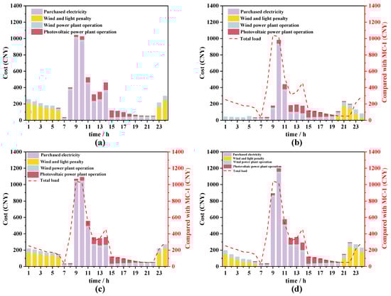 Economic analysis of the integrated energy system for a typical day in the transition season: (a) disordered mode (MC-1); (b) ordered mode (MC-2); (c) peak-load shifting mode (MC-3); (d) equalization mode (MC-4).