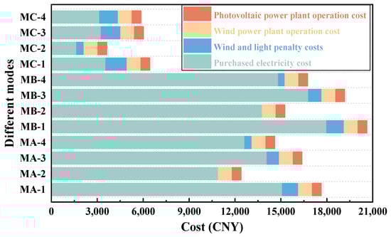 To facilitate a comprehensive comparison of load costs across four distinct charging modes on three representative days, the total load costs for twelve cases are presented collectively in Figure 12. This figure clearly illustrates that during the transition season (MC), the total load costs across all modes are lower than the corresponding costs in summer (MA) and winter (MB) due to favorable temperatures and decreased electricity demand. However, it is noteworthy that the wind and solar penalty costs remain relatively high. Across all seasons, the ordered modes (MA-2, MB-2, and MC-2) demonstrate the most pronounced advantages, reflecting significant reductions in both purchasing costs and wind and solar penalty costs. Notably, both MA-2 and MB-2 do not exhibit instances of the curtailment of wind and PV power generation. This indicates substantial improvement in the economic efficiency of the system and the consumption rate of renewable energy.
