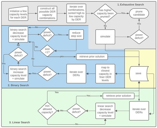 Algorithm 2 starts by initializing a set of potential solutions to the set of solutions identified by the exhaustive search in Algorithm 1. The outermost ‘for loop’ iterates over each potential solution. The first nested ‘for loop’ iterates over each DER and (i) initializes its capacity levels and (ii) sets the starting point for the potential solution to the closest levels compared to the original values from the coarser capacity levels used during the exhaustive search phase. The potential solution is then simulated. The second nested ‘for loop’ iterates several times over the same potential solution and initializes the search direction based on whether a power deficit arose, increasing capacity if a deficit was detected and decreasing it if not. This ‘for loop’ combined with the next inner ‘for loop’ allows for randomizing the order in which DERs are explored, so that the capacity of one DER can be adjusted sooner than other DERs in some iterations and later in other iterations. The ‘while loops’ execute the binary search on the current DER, proceeding until the current solution (i) has a power deficit more than the prior solution or (ii) has a power deficit of zero with a search direction of increasing capacity. In the latter case, the search direction is then reversed and the search continues to decrease capacity until a power deficit arises. Every solution simulated is stored in . After the algorithm is terminated, all dominated potential solutions are pruned from .