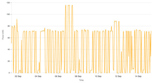 The computational example is motivated by a military deployment with a planned duration of two weeks, using the baseline power load shown in Figure 2, which is the same as in [23,24]. The time horizon is discretized into 4-min intervals, which translates to 5040 time steps at which the microgrid’s operation is simulated. If substituting hourly data that encompass typical discretization in commercial software products, the same problem size would accommodate a 7-month planning horizon.