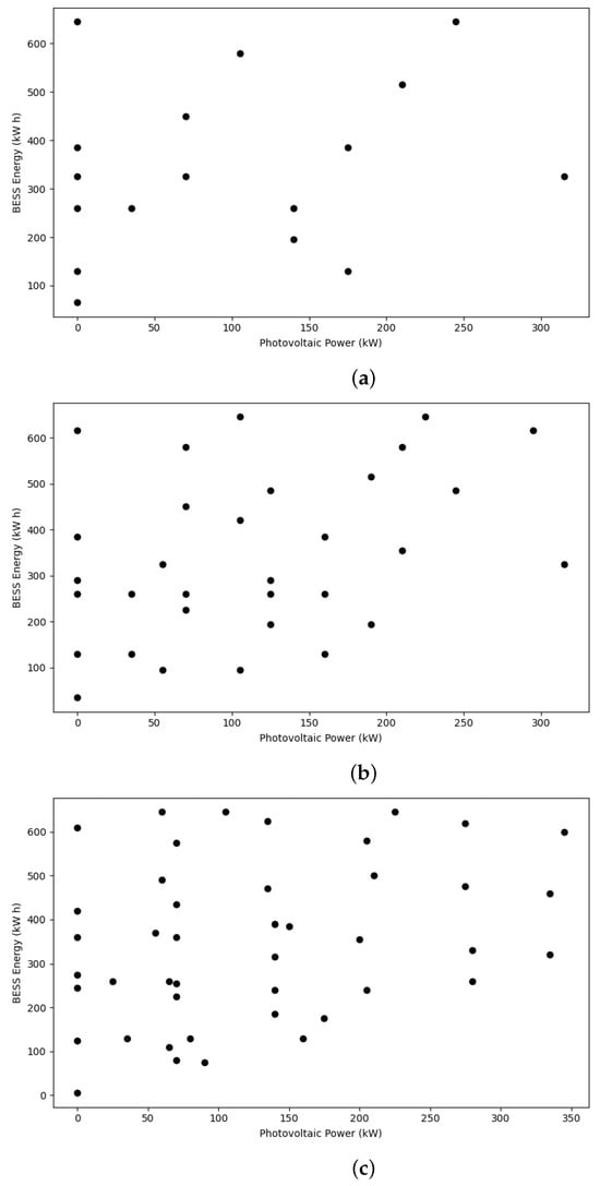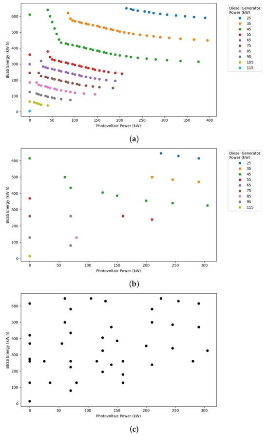 The three plots show solutions generated by the heuristic sizing method with different numbers of capacity levels: (a) 11 levels, (b) 21 levels, and (c) 161 levels. Approximate diesel generator capacity for each solution can be inferred from Figure 3.