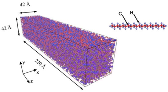 The AIREBO potential was chosen due to its robust capability to model covalent C-C and C-H bonds, as well as torsional and non-bonding interactions, critical for accurately simulating the polyethylene chains and functionalized graphene in our study. Its adaptive nature ensures reliable representation of bond formation and breaking, particularly relevant for the H, CH3, and C2H5 functional groups attached to graphene. This potential has been widely validated in graphene–polymer systems, such as in Luo and Lloyd [18] and Razzaghi et al. [23], making it well suited for investigating thermal transport in our nanocomposites. The Lennard–Jones potential function was employed to describe the nonbonding interactions between 2D nanostructures and polyethylene atoms. The representation of the Lennard–Jones coefficients can be found in Table 1. In this study, we focused on investigating the thermal transport in polyethylene polymer. To do so, we constructed a rectangular cubic box with dimensions of 42 × 42 × 220 Å in the x-, y-, and z-directions, respectively, as shown in Figure 1. This simulation box was then used to calculate the thermal conductivity of polyethylene/graphene and polyethylene/functionalized graphene nanocomposites. Considering the density of polyethylene, which is known to reach a maximum value of 0.975 g/cm3, the box contained a total of 152,000 atoms. To minimize the finite size effect, a periodic boundary condition was imposed in the x- and y-directions of the box. The box was partitioned into 22 slabs along the z-direction, which also corresponded to the direction of the heat flux. The two slabs at both ends were fixed to ensure the heat insulation boundary condition.