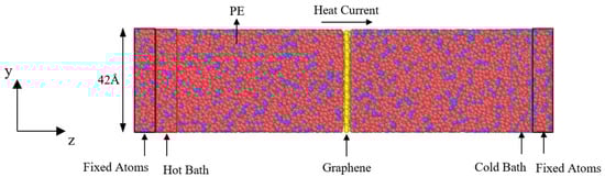Structure of the polyethylene simulation box containing a graphene sheet to calculate the effective thermal conductivity.