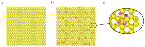 Graphane was constructed by placing the hydrogen atoms on all carbon atoms on both sides of the graphene. Next, the hydrogen atoms were randomly excluded from both sides of the graphene structure to obtain the desired volume fractions. The initial arrangement involved patterning methyl and ethyl groups to eliminate the possibility of two adjacent groups and ensure a more controlled and accurate representation. Subsequently, the remaining extra groups were randomly omitted to achieve a more reasonable arrangement. The resulting configuration in Figure 3 presents a graphene structure with a volume fraction of functionalized groups amounting to 5%.